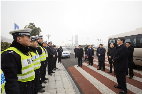 2月22日上午,市委书记姚晓东率市四套班子领导,到市区翔宇大道枚皋路口执勤岗点,亲切慰问路面执勤民警。